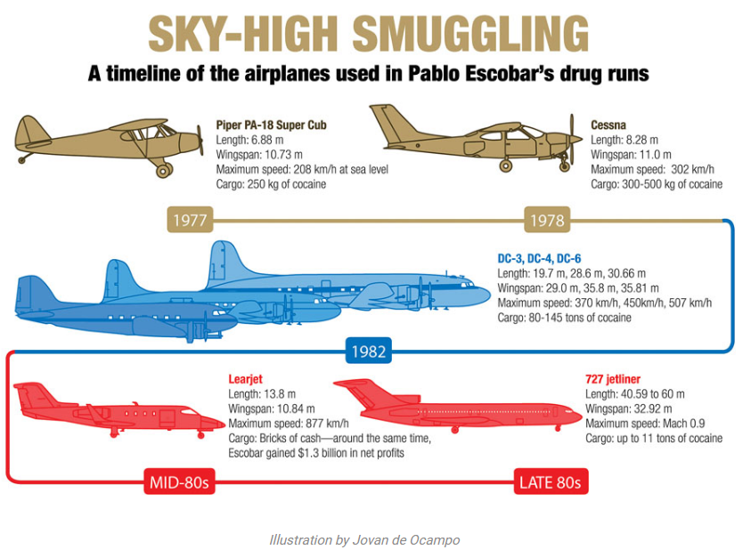 2018 ABS-CBN News article has nicely outlined Pablo Escobar’s drug routes and aircraft along with a timeline of when they were used.
